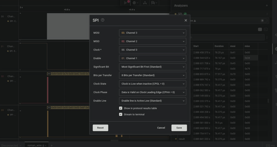 Data is transferred on both MOSI and MISO. Deinterleave and print as ascii: