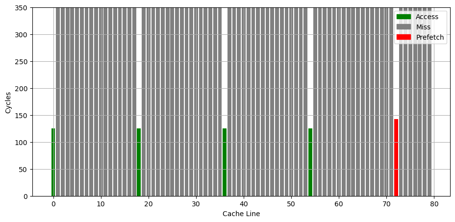 继续增加访问次数,可以看到预取器总是会预取将要访问的下一个 cache line: