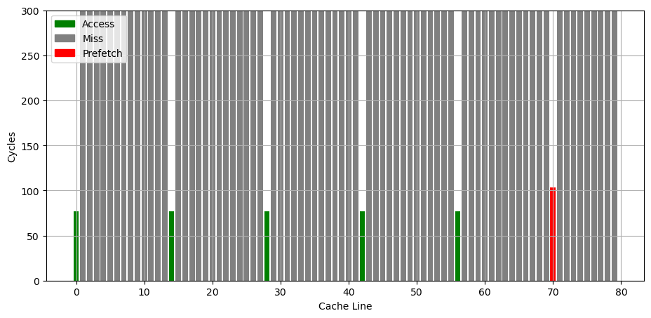 接下来,按照固定的 stride 访问各个缓存行,发现当访问了五个 cache line 时,预取器会比较稳定地预取第六个 cache line: