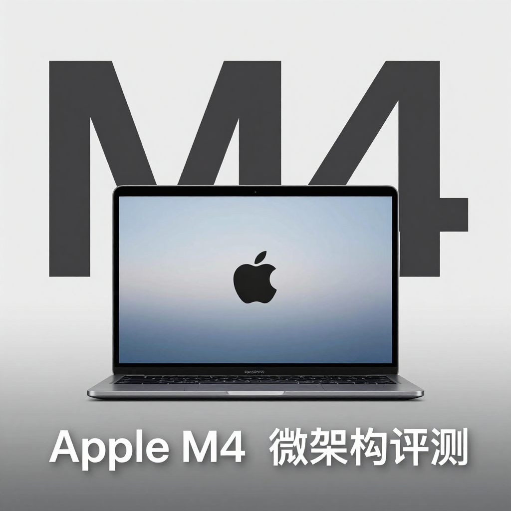 使用 Z-Image 生成,提示词: Create a cover iamge for Apple M4 微架构评测, with a proper Apple M4 MacBookAir in the middle with M4 in the background, your text must be accurate