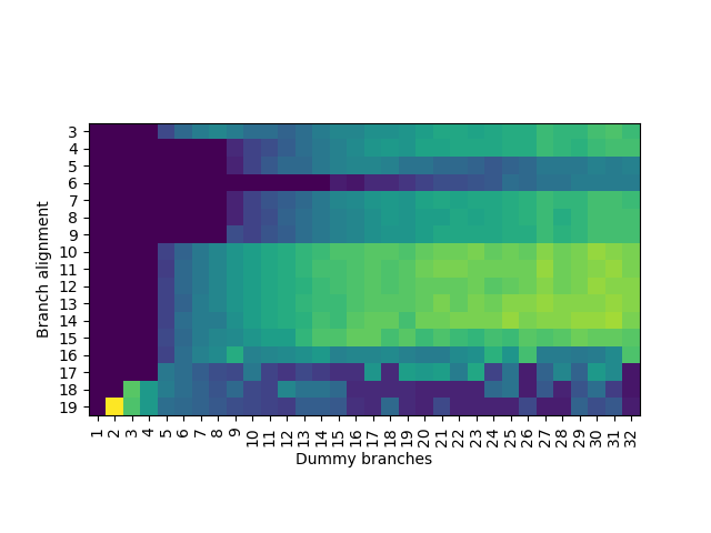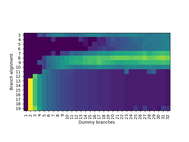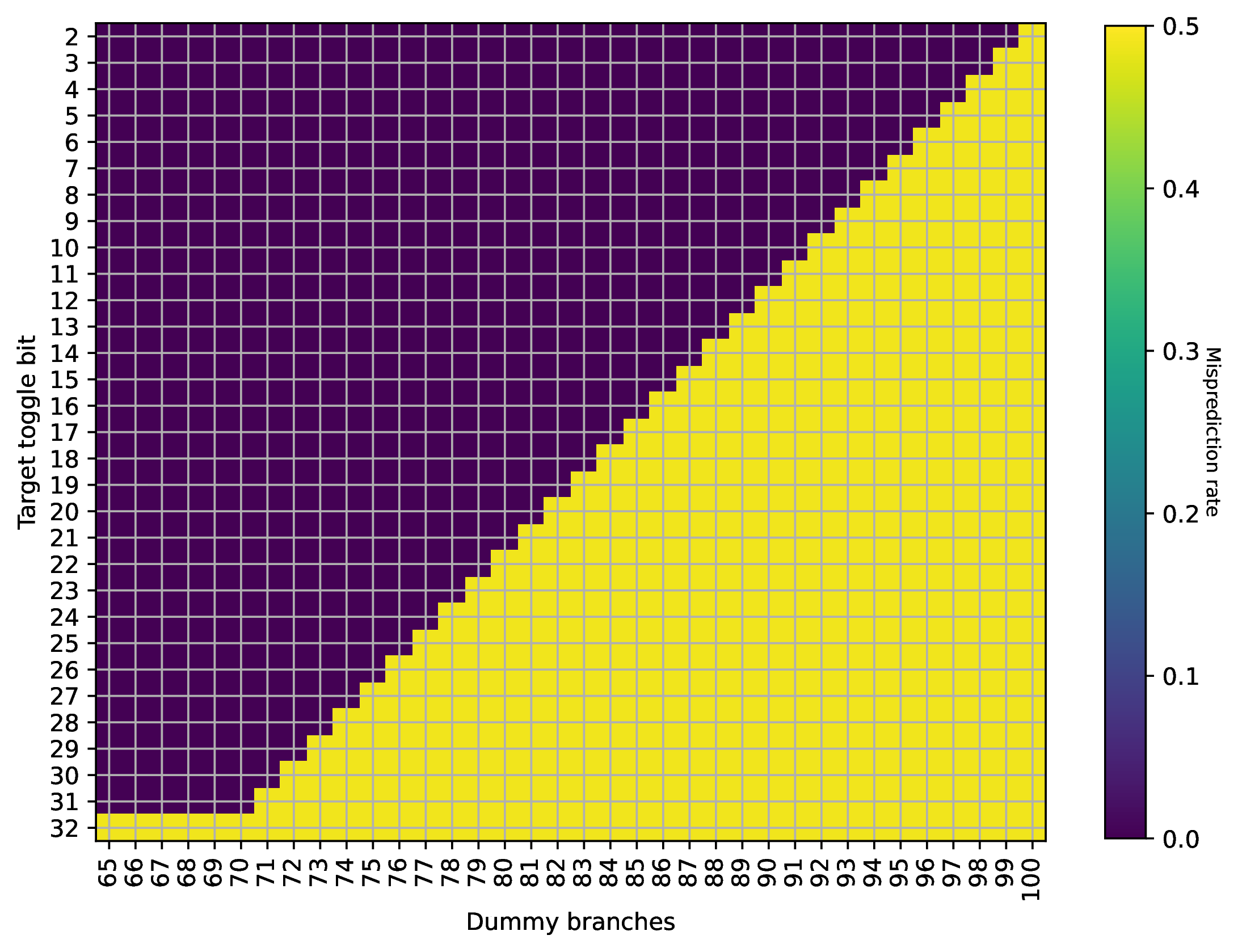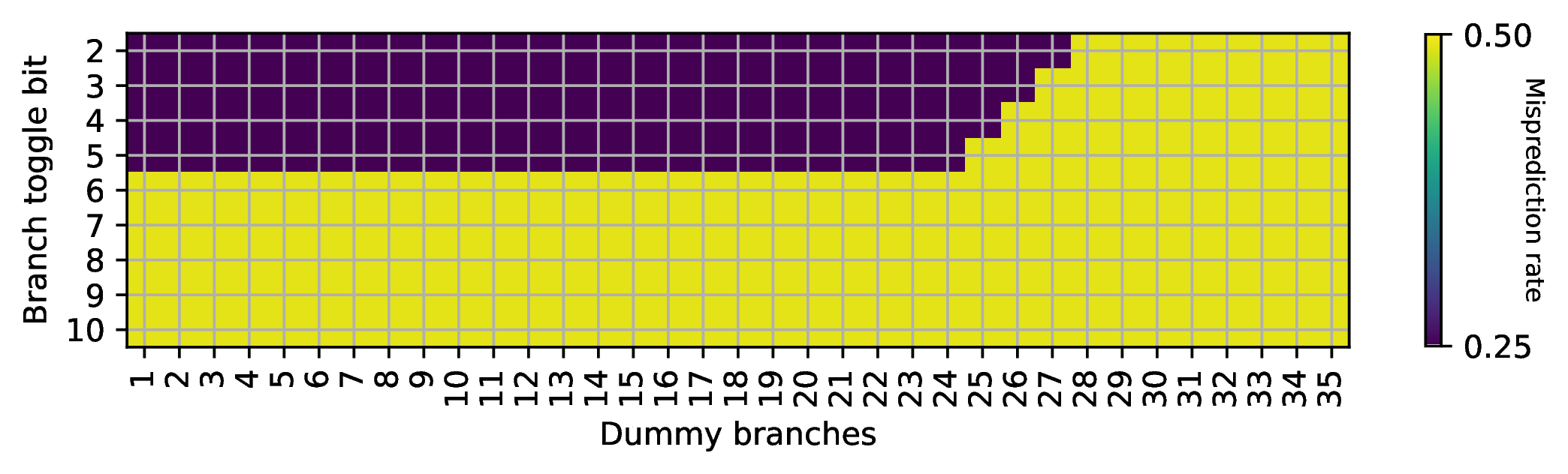 横坐标 Dummy branches 指的是上面第三步插入的无条件分支的个数,纵坐标 Branch toggle bit 代表修改的是具体哪一个 \(B[i]\),颜色对应分支预测的错误率,浅色部分对应最后一条分支只能正确预测 50%,深色部分对应最后一条分支总是可以正确预测。