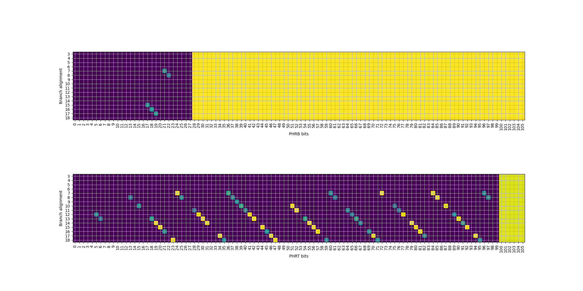 其中 \(\mathrm{footprint}\) 是通过分支地址和目的地址计算得到的哈希值。接下来的任务是确定 \(\mathrm{PHR}\) 的位宽、每次左移的位数,以及 \(\mathrm{footprint}\) 的计算方法。