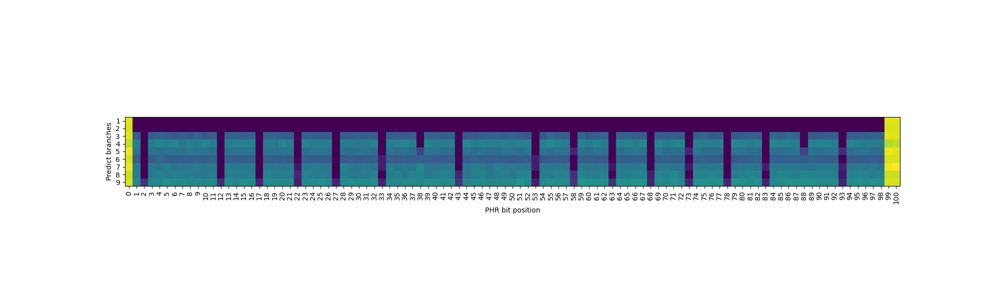 根据上面的实验,可见 \(B[5], B[4], B[3], B[2]\) 参与到了 \(\mathrm{footprint}\) 计算中,而 \(B\) 的其他位则没有。但比较奇怪的是,\(\mathrm{PHR}\) 理应可以记录最近 100 条分支的信息,但实际上只观察到了 28。所以一定还有其他的信息。