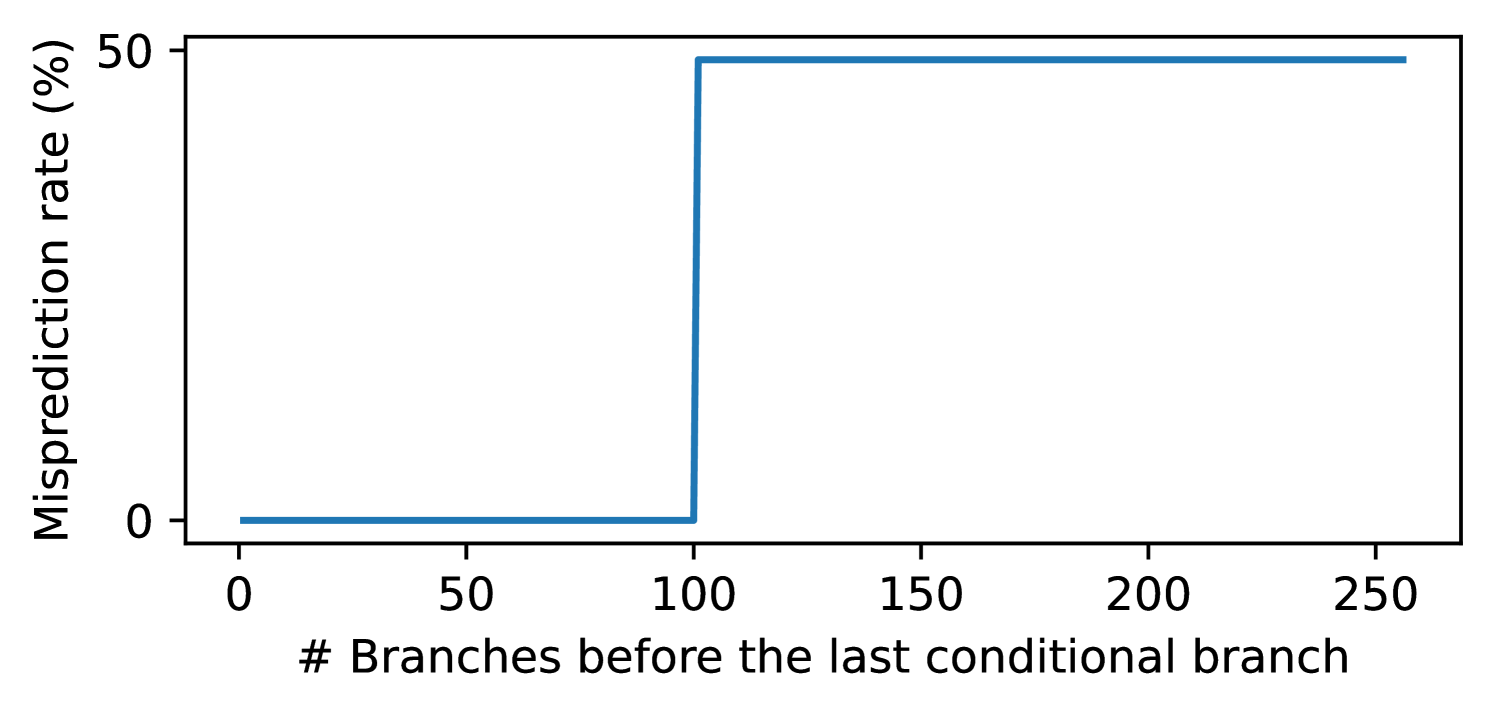 通过构造上述程序,调整中间无条件分支的数量,并使用性能计数器统计分支预测错误率,可以找到一个临界点。当无条件分支数量超过这个阈值时,第二个条件分支的错误预测率会从 0% 上升到 50%。这个临界点对应 \(\mathrm{PHR}\) 能够记录的分支历史数量,即 \(\lceil n / \mathrm{shamt} \rceil\)。
