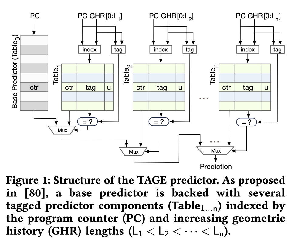 目前主流处理器普遍采用 TAGE 预测器,它在上述基础查表方法的基础上进行了重要改进: