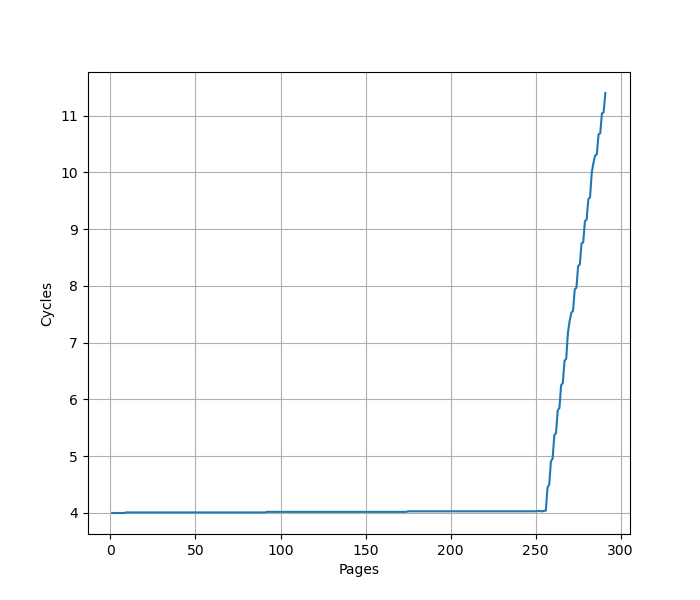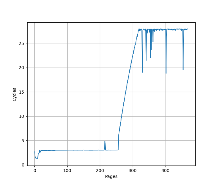 可以看到明显的 256 pages 的拐点,对应了 256 entry 的 L1 ITLB。CPI 从 3 升高到了 28。