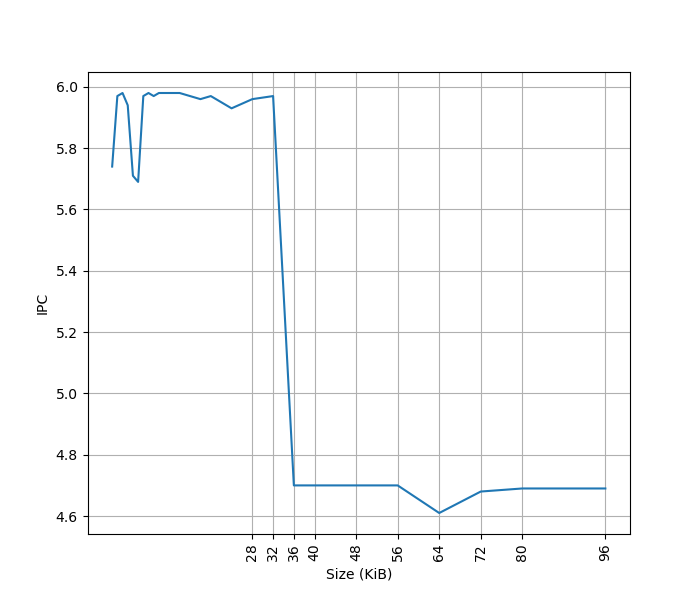 测试环境是 SMT4 Core,所以只有 32KB 的容量。超出 L1 ICache 容量后,IPC 从 6 降低到了 4.7。