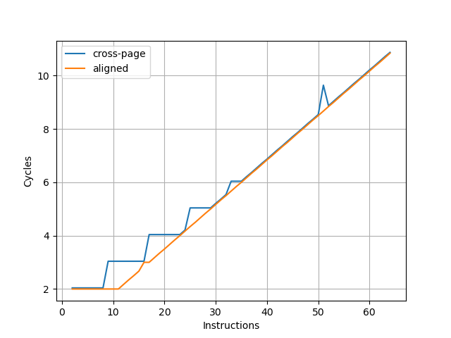 为了确认这个瓶颈是由取指造成的,又构造了一组实验,把循环的所有指令都放到一个页中,这个时候 Fetch 不再成为瓶颈(图中 aligned),两个曲线的对比可以明确地得出上述结论。