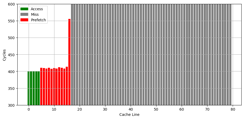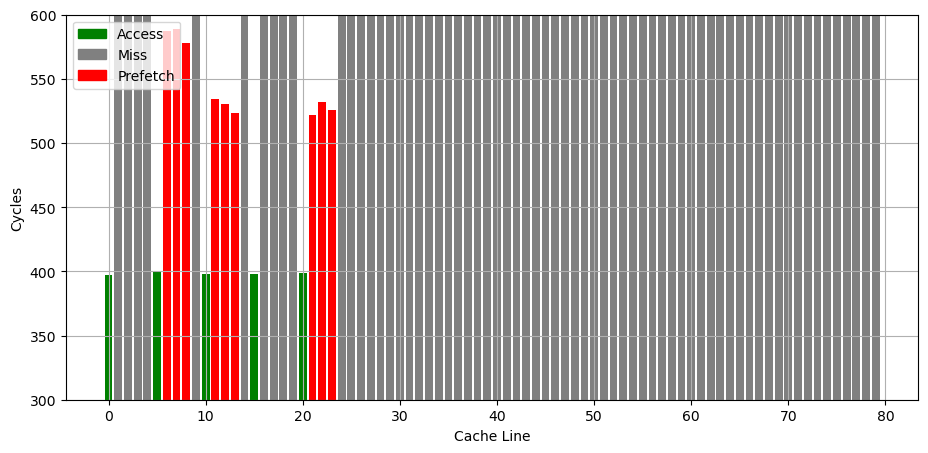 参考 Battling the Prefetcher: Exploring Coffee Lake (Part 1) 的方式,研究预取器的行为:分配一片内存,把数据从缓存中 flush 掉,再按照特定的访存模式访问,触发预取器,最后测量访问每个缓存行的时间,从而得到预取器预取了哪些缓存行的信息。