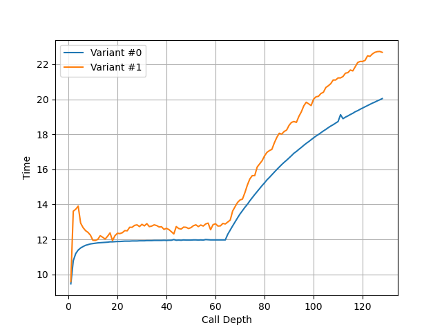 构造不同深度的调用链,测试每次调用花费的时间,得到如下测试结果:
