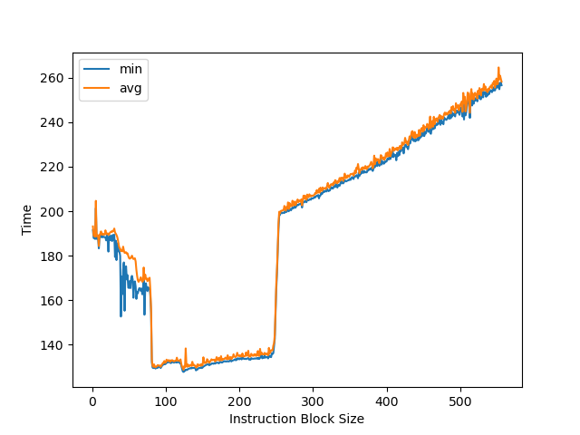为了测试 L1 ITLB 的容量,构造 b 序列,每个 b 在一个单独的页(64KB 的页大小)中,观察 b 的性能: