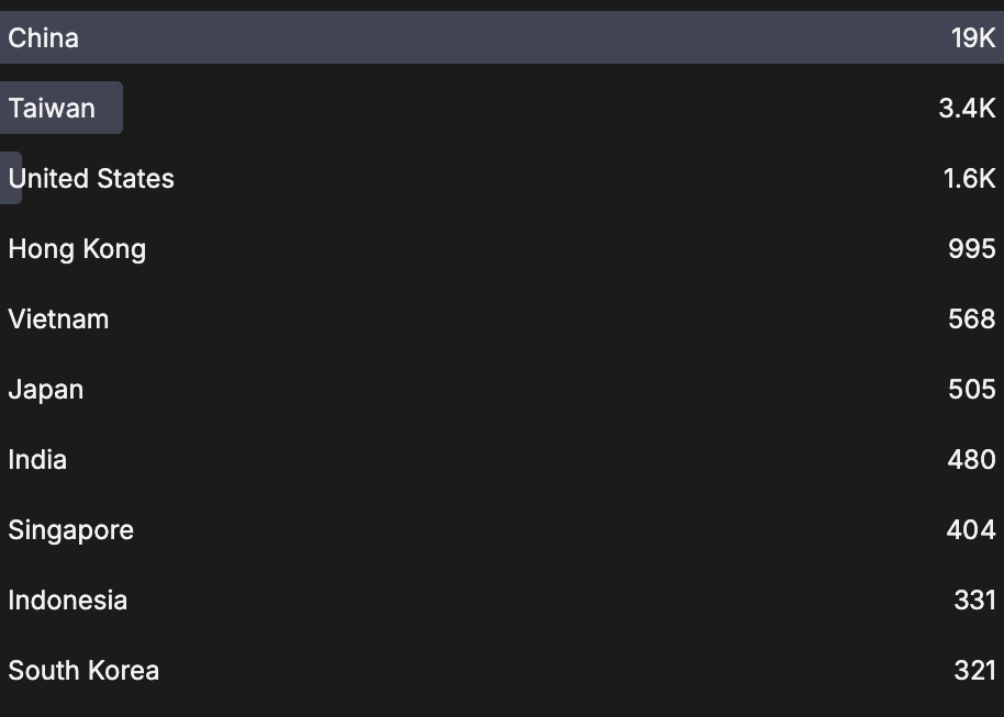 由此推测,学生读者占比较高。结合国庆假期访问量的下降来看,国内读者仍是主力。下面是各国家与地区的访问分布: