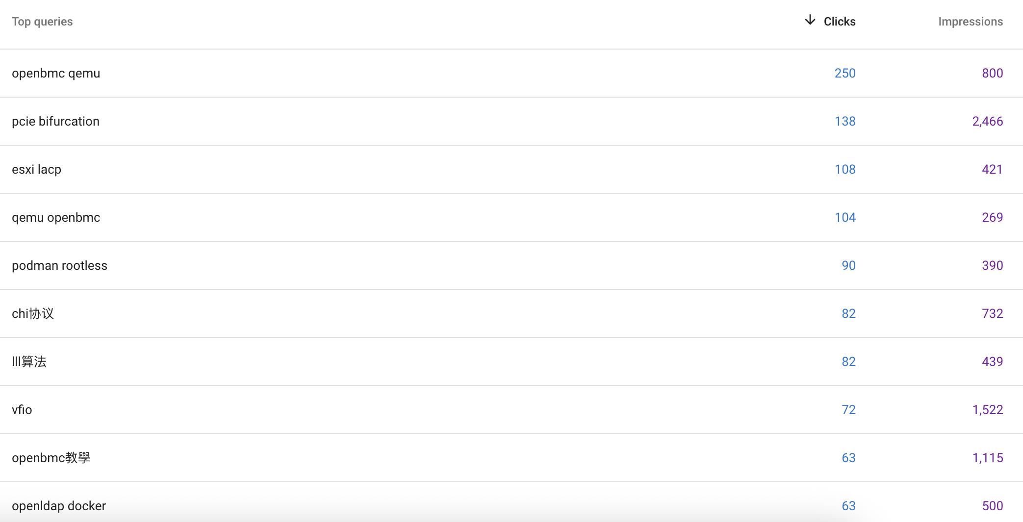 这个排名有些出乎我的意料。这几篇文章在撰写时并未特别考虑入门读者的理解难度或内容的丰富性。或许是因为它们涉及的领域资料较少,因此在相关关键词搜索中容易被找到。这一点在 Google Search Console 中也得到了印证: