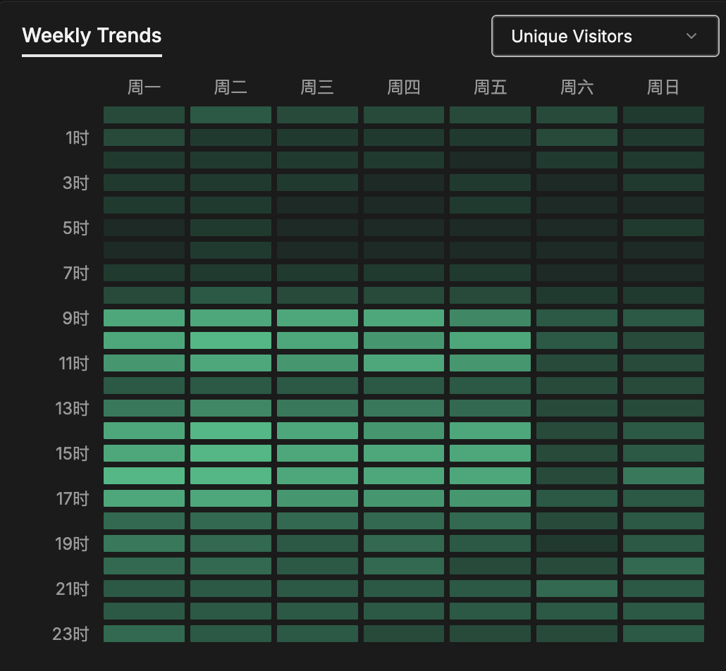 - 工作日访问量显著高于周末,通常为周末的两到三倍;